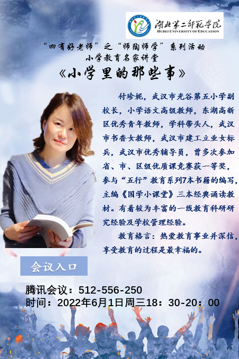 付珍妮,武汉市光谷第五小学副校长,中共党员,小学语文高级教师,东湖高新区优秀青年教师,学科带头人,武汉市书香女教师,武汉市建工立业女标兵,武汉市优秀辅导员。曾多次参加省、市、区级优质课竞赛获一等奖,参与“五行”教育系列7本书籍的编写,主编《国学小课堂》三本经典诵读教材。有着较为丰富的一线教育科研研究经验及学校管理经验。