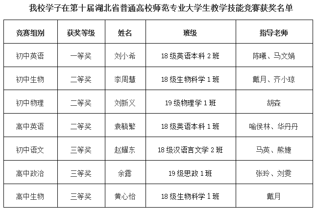 本网讯(通讯员 李娜)6月1日,第十届湖北省普通高校师范专业大学生教学技能竞赛结果揭晓,我校共14人参赛,7人获奖,其中一等奖1名、二等奖3名、三等奖3名。