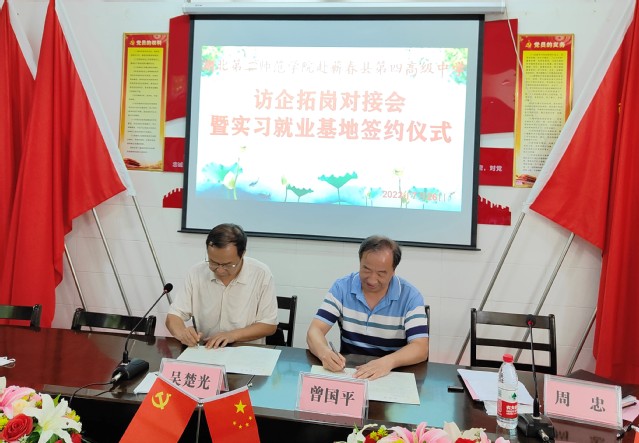 曾国平与两所学校校长分别签订了实习就业合作协议。周忠为两所学校进行教育实习就业基地授牌。