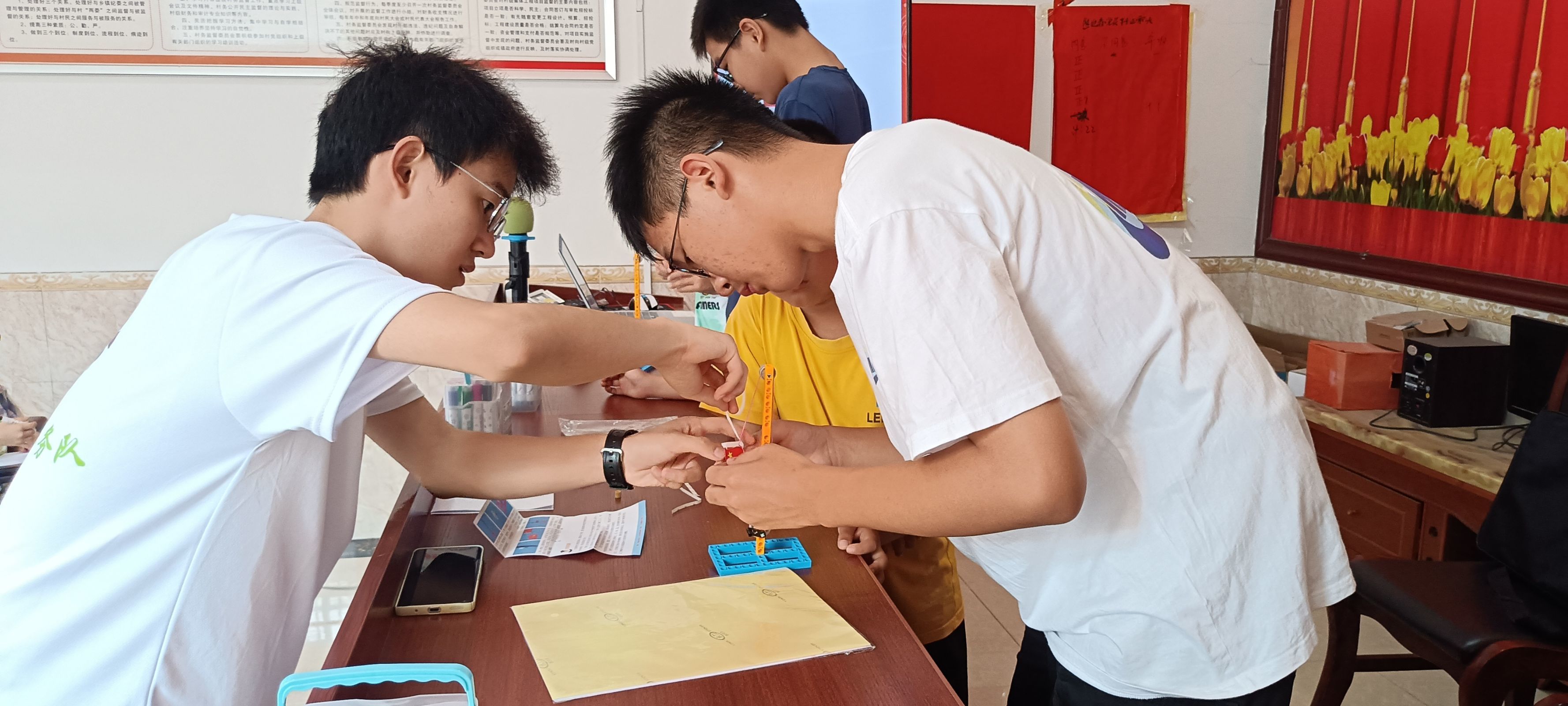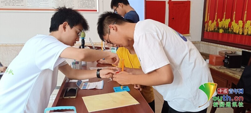 图为志愿者雷陈举教孩子们搭建国旗升降装置。 中国青年网通讯员 徐珍 供图