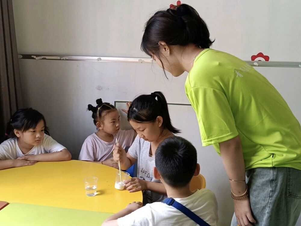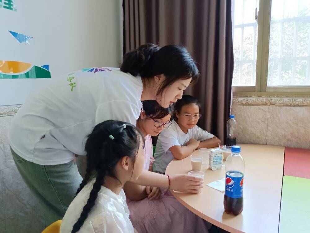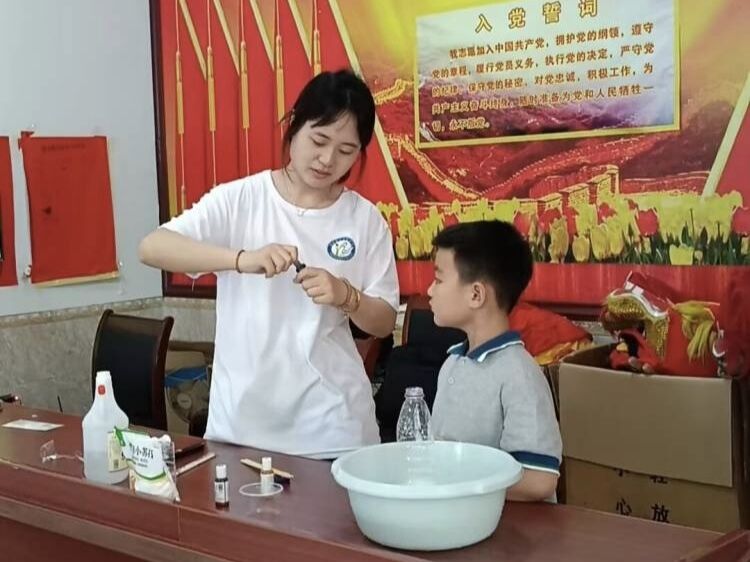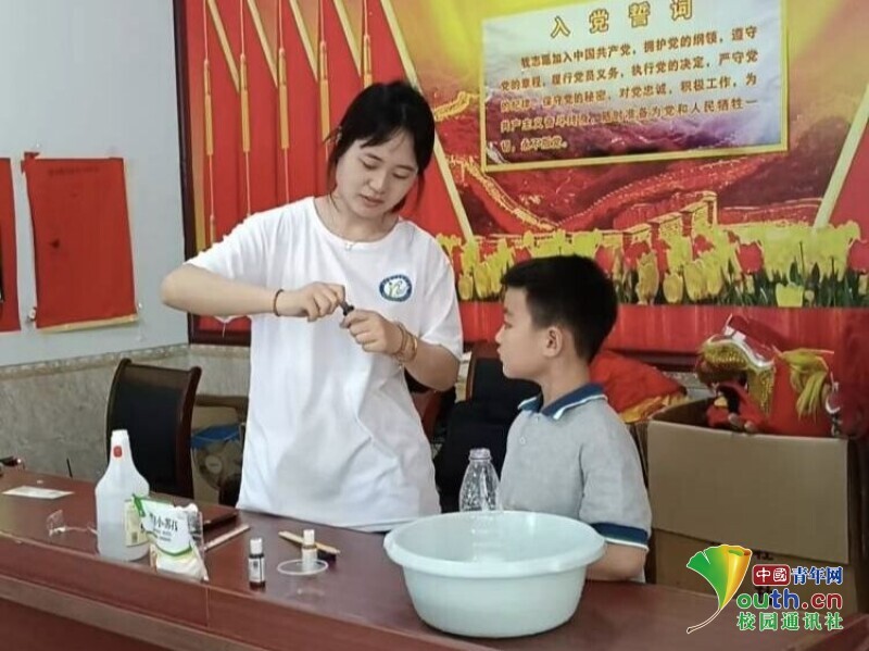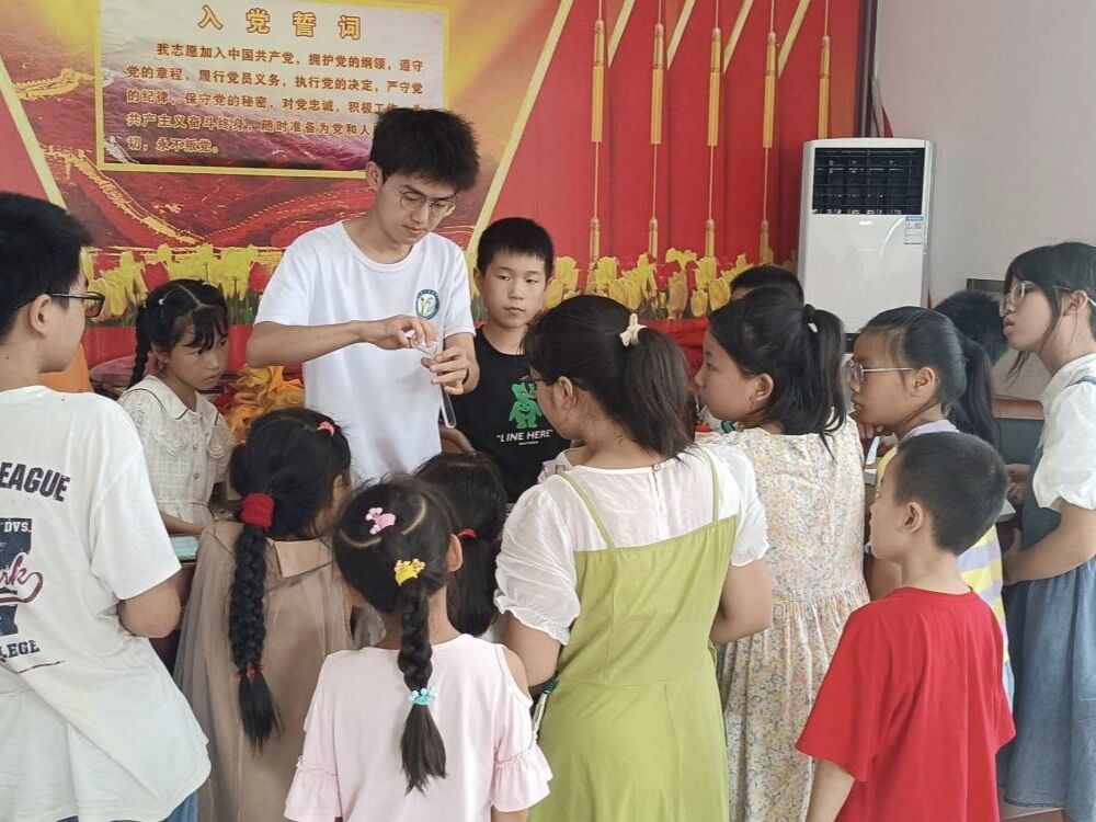 中国青年网荆州8月9日电(通讯员 杨琪)为了推进科学知识的普及,提升乡村学子的科学素质,有效助力乡村科学教学,2023年7月,湖北第二师范学院青葵志愿服务队的第三小队前往湖北省松滋市斯家场镇舞龙山村,为当地乡村学子开启了一扇激发科学兴趣的窗口,并结合自身团队的优势,开设了涉及物理、化学和生物科目的科普实验课,其中包括神奇的“非牛顿流体”,时间流转却保持不变的“动植物标本”等实验。这些实验不仅具有观赏性,更能让学生们通过亲身实践去探索科学世界的奥秘。