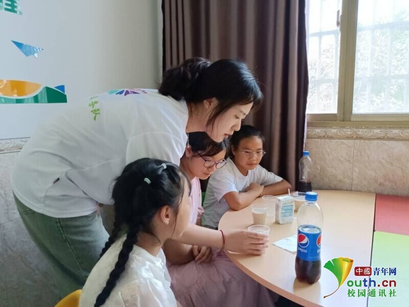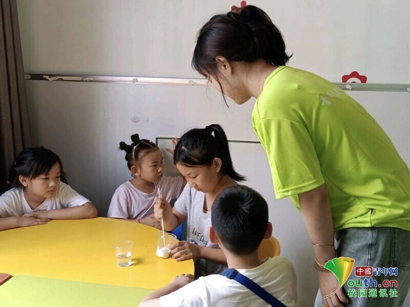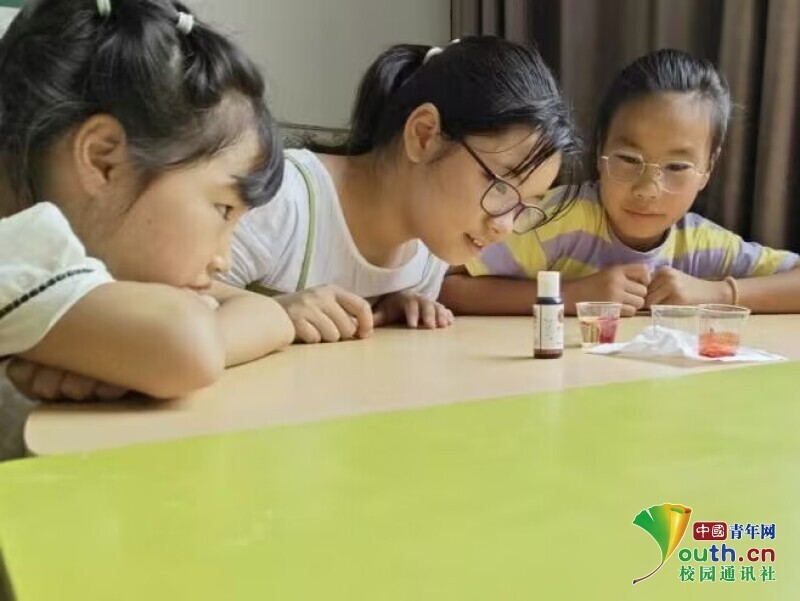 图为7月24日在科普课“黑白配”课堂上,志愿者指导学生进行实验。中国青年网通讯员 徐珍 供图
