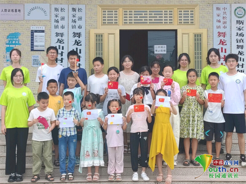 图为完成“建国大业”课程后,学生们带着自己画的国旗与志愿者合影留恋。中国青年网通讯员 徐珍 供图