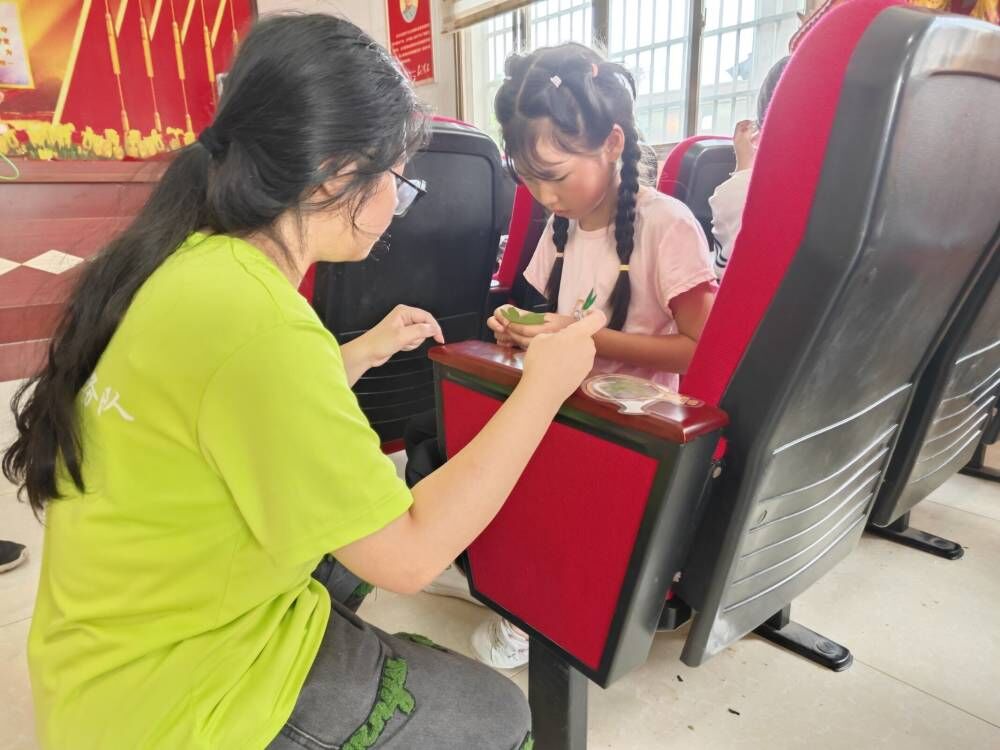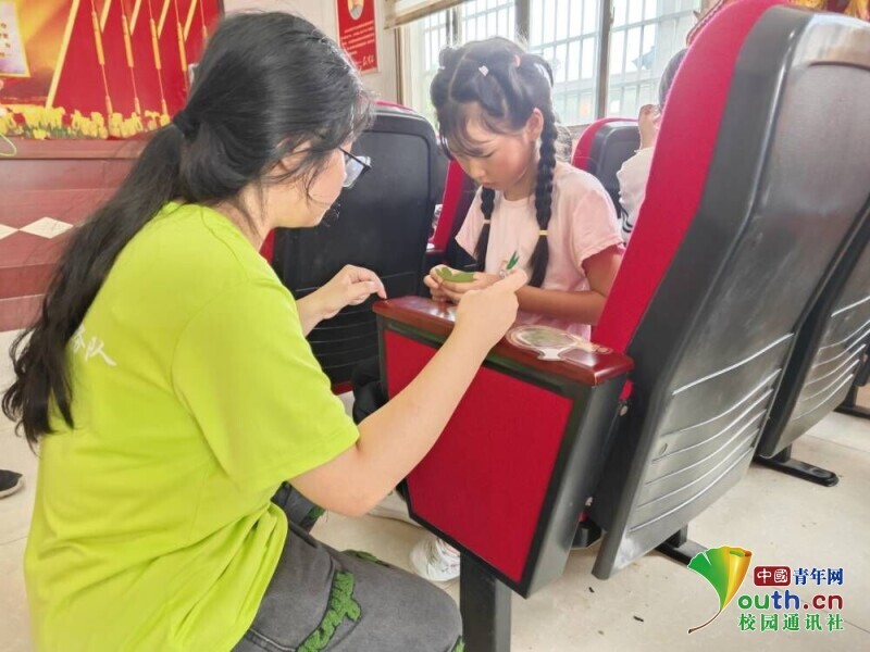 图为7月25日在科普课“花卉植物的了解”课堂上,志愿者帮助学生制作植物叶子的便签。中国青年网通讯员 杨琪 供图