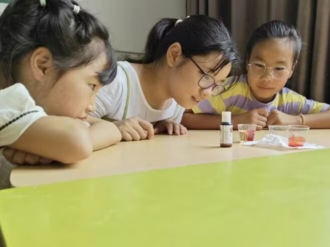 图为7月21日在科普课“维C为何能让碘伏变色”课堂上,在经过志愿者讲解完实验原理和步骤后,学生们动手实验并观察实验现象。中国青年网通讯员 徐珍 供图