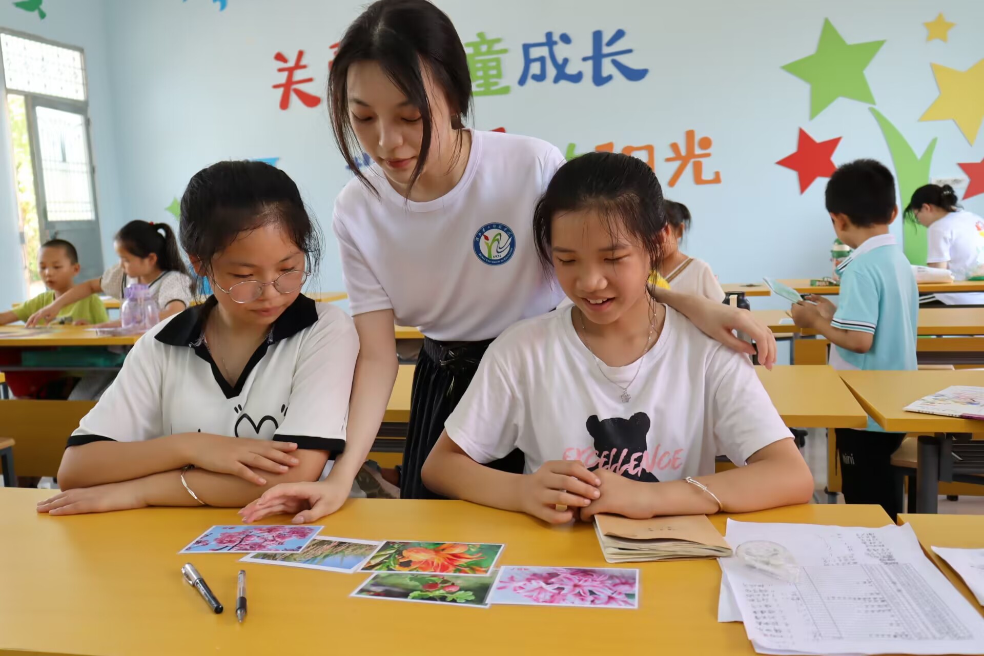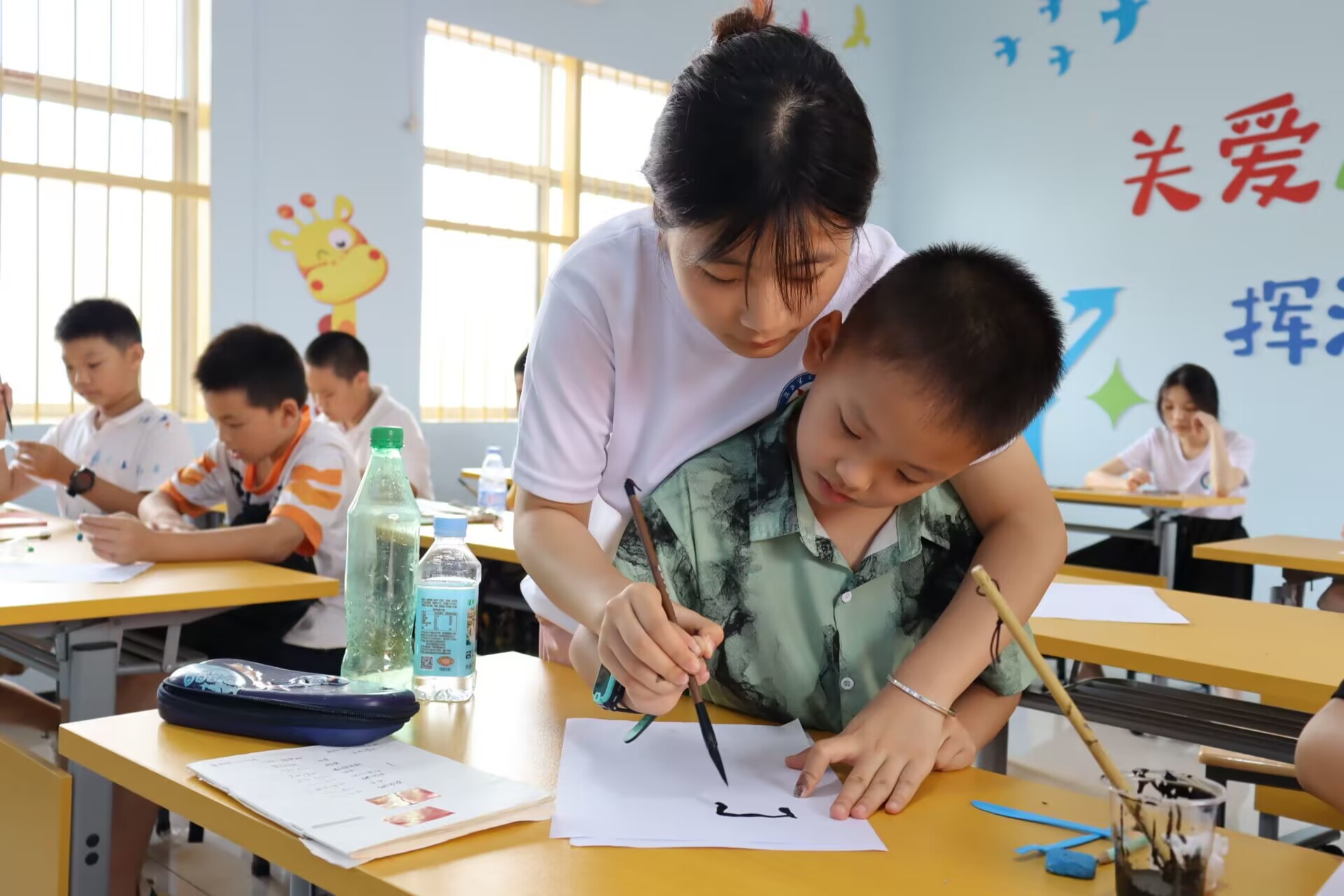 图为志愿者在指导小朋友写“中国”两字 。中国青年网通讯员 刘雨婷 摄