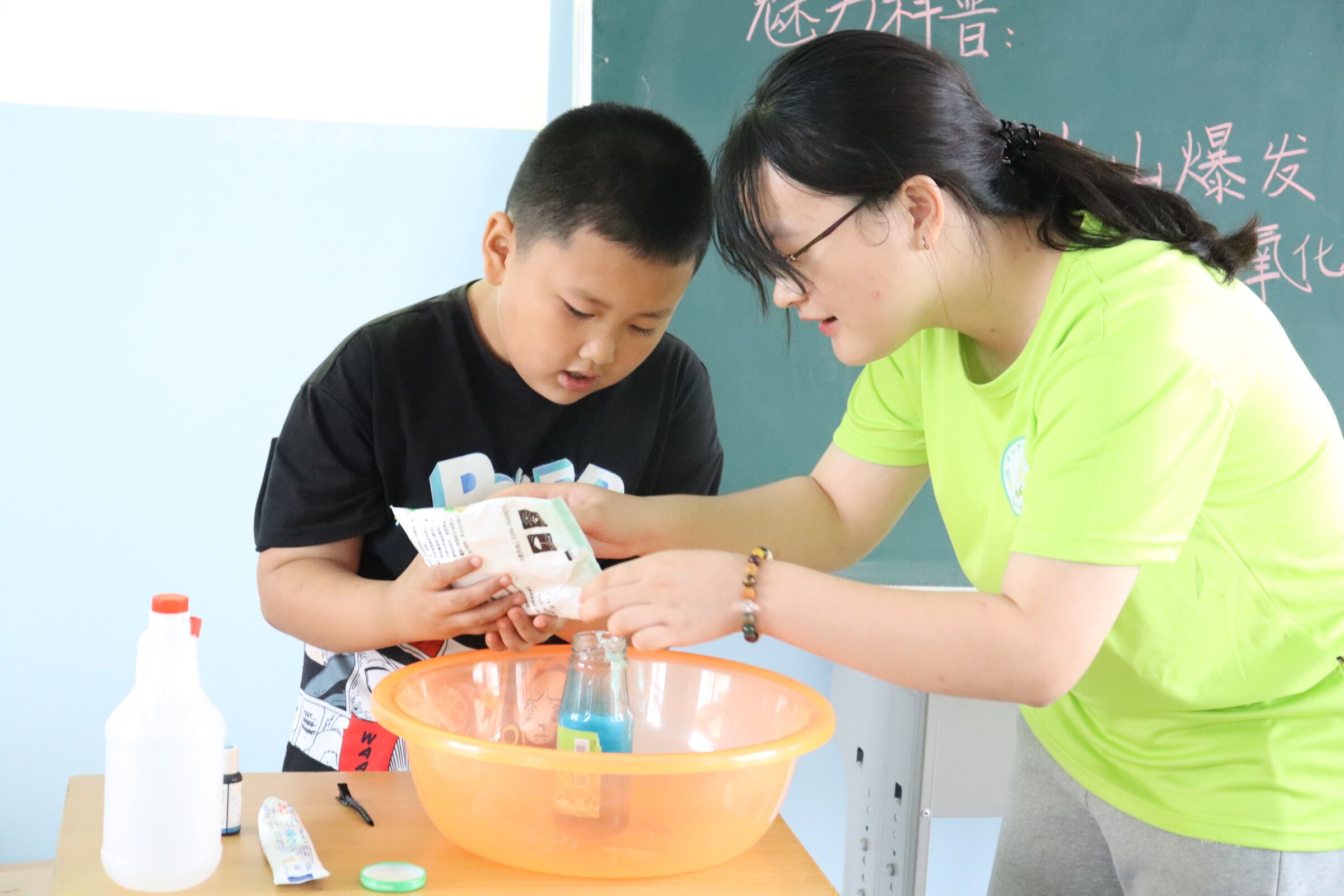 图为志愿者演示后,小朋友们积极上台参与科普实验互动,将实验所需小苏打按步骤进行添加。中国青年网通讯员 蒋怡菲 供图
