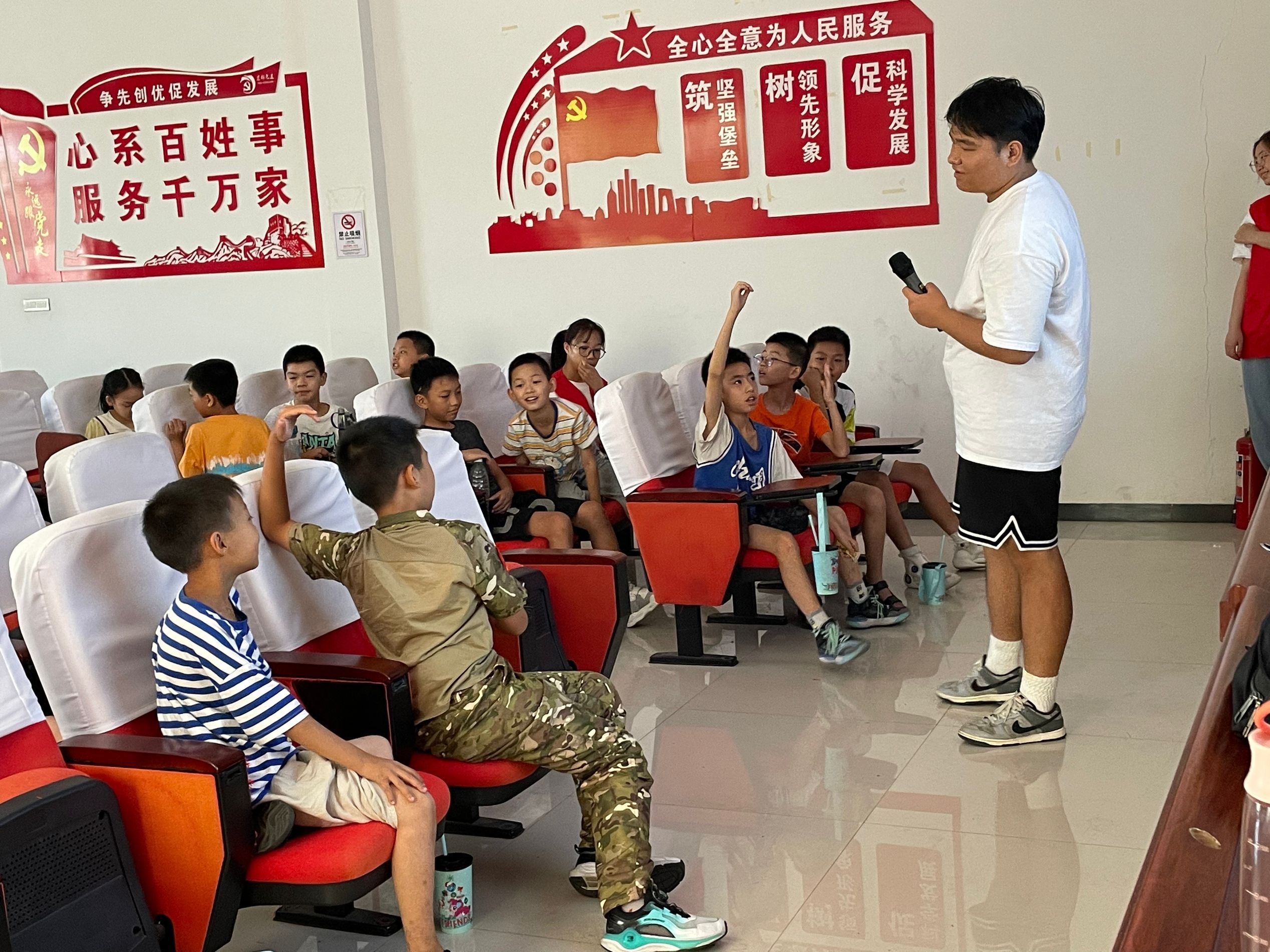 8月1日是我们的活动开班仪式,孩子们都有些拘谨,于是我们进行一次自我介绍环节进行破冰。志愿者小老师们和孩子们一个个上台进行介绍,大家互相倾吐着自己的目标与梦想,畅所欲言。我们不仅成功活跃了气氛,还拉进了彼此的距离。看着他们打闹嬉戏的样子,我仿佛也回到了我的童年时刻。