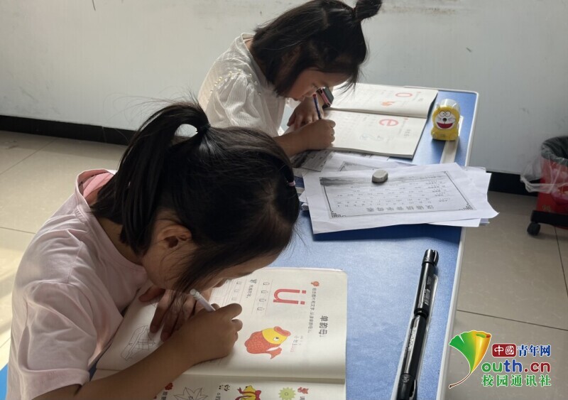 图为志愿者为学生辅导学生拼音。中国青年网通讯员 冯怡渟 摄
