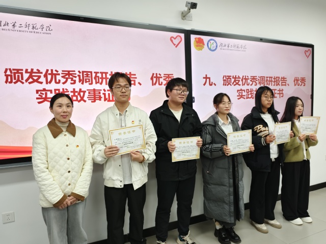本次活动对在“三下乡”活动中表现突出的个人和团队进行了表彰。张灏、邱梦莹、高丽娥分别为“优秀通讯员”“先进个人”“优秀实践故事及优秀调研报告”获奖者颁发证书。优秀通讯员代表李佳欣和先进个人代表王盈盈上台发言,分享了自己在“三下乡”活动中的收获与体会。