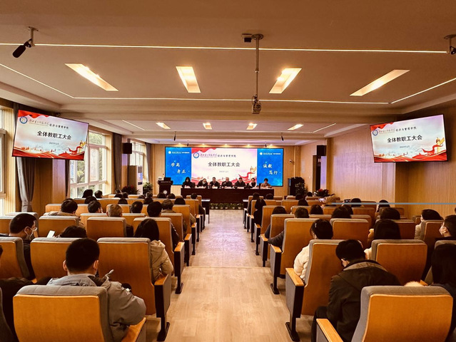 本网讯(通讯员 席中刚)2月23日下午,经济与管理学院于2号教学楼三楼多功能报告厅召开2023年春季学期教职工大会。经济与管理学院党委书记刘元锋,院长陈池波,党委副书记李京,副院长陈艳明、常静、蔡璐,院长助理刘爱君出席,全体教职工参加会议。会议由刘元锋主持。