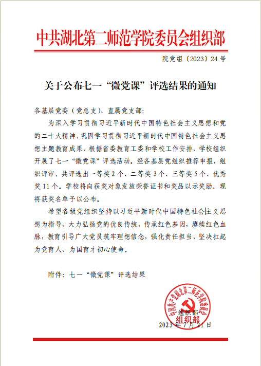 本网讯(通讯员 谭芳)近日,中共湖北第二师范学院委员会组织部公布七一“微党课”评选结果,经济与管理学院推荐申报的3项七一“微党课”作品获奖,其中席中刚老师的《青春心向党,传承二七革命精神》获评校级二等奖,徐梅馨老师的《忆峥嵘岁月,弘首义精神》和马勇老师的“教育现代化促进中国式现代化目标实现”获评优秀奖。