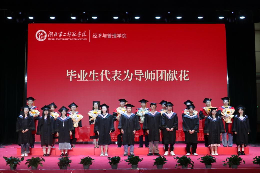 陈艳明宣读《湖北第二师范学院关于授予2024届普通本科毕业生学士学位的决定》,郑军为优秀毕业生代表拨穗并授予学位,毕业生代表为郑军献花并合影留念。