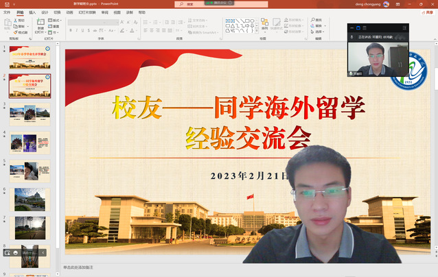 2月21日10:00,计算机学院在线上举办校友出国留学交流会出国留学分享会,2019级计算机科学与技术(中外合作办学)专业全体学生、学院其他专业部分学生参加会议,会议由邓重阳主持。