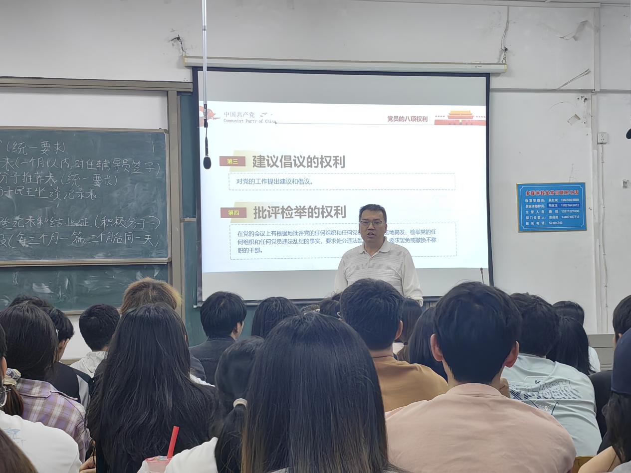本网讯(通讯员 范云天)5月26日晚,计算机学院分党校第108期发展对象专题党课在10号教学楼10301举行,计算机学院副院长王海军以《中国共产党党员的义务和权利》为题作专题授课。