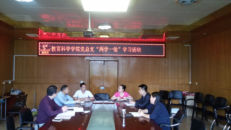 【本网讯】6月3日上午,教科院党总支在五号楼四楼会议室举行“两学一做”学习活动,在前期动员部署的基础上,进行深入学习和研讨。党总支书记熊华生同志主持学习活动,院长张红梅、党总支副书记林志红、党总支组织委员吴贤华、党总支宣传委员李小兵参加会议,学生党支部书记代黎明列席会议。