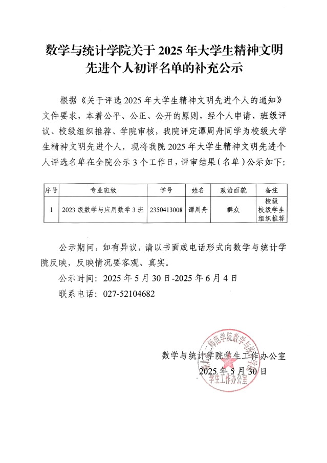 【通知公告】数学与统计学院关于2025年大学生精神文明先进个人初评名单的补充公示