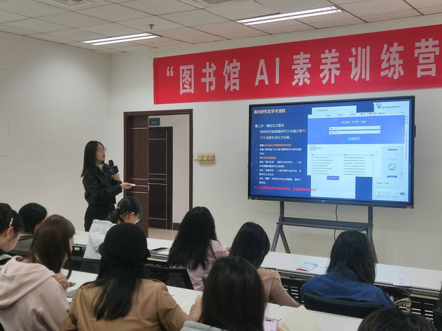 在AI技术迅猛发展并深刻影响学术研究模式的新时代背景下,图书馆积极探索创新服务模式,精心策划了“图书馆AI素养训练营”系列培训讲座,旨在通过系统培训,帮助我校师生熟练应用AI工具,提升学习科研效率,开拓创新思维。3月27日,“图书馆AI素养训练营”首场培训讲座——“智驭信息浪潮,AI 助力学术进阶”正式拉开帷幕,吸引了众多师生热情参与。