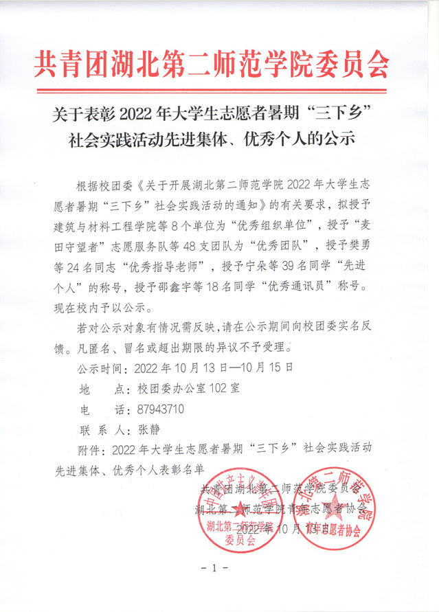 关于表彰2022年大学生志愿者暑期”三下乡“社会实践活动先进集体、优秀个人的公示