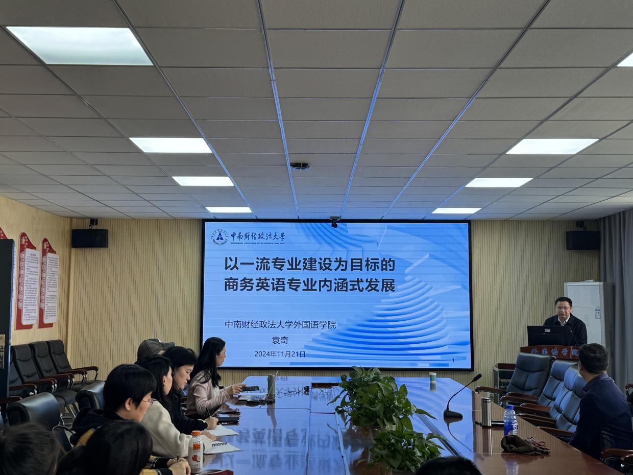 外院网讯(通讯员 邱辛欣)11月21日下午,中南财经政法大学外国语学院副院长袁奇教授应邀莅临外国语学院,就“以一流专业建设为目标的商务英语专业内涵式发展”主题进行了一场精彩的学术讲座。此次讲座由外国语学院院长刘晖主持,商务英语专业负责人欧秋耘、系主任孙玲燕、师生代表及英语系部分教师参加了此次活动。