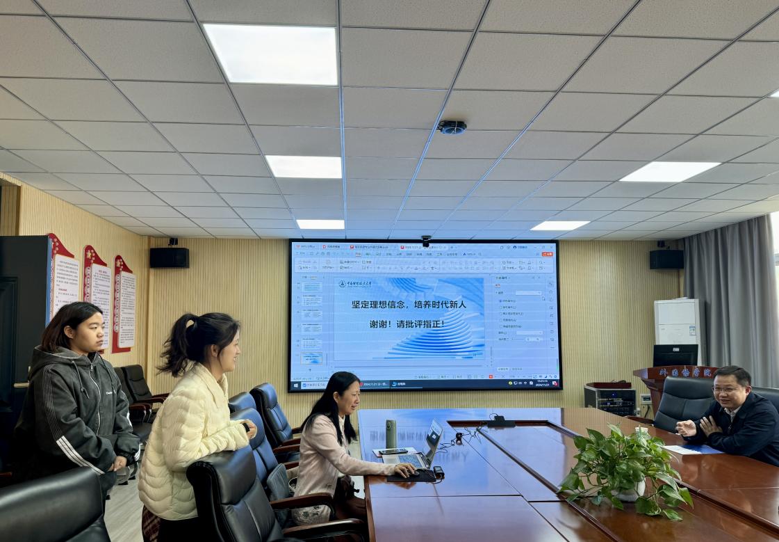 商务英语专业23级学生向妃雪(左一)、李旻谦(左二)与袁奇教授进行交流