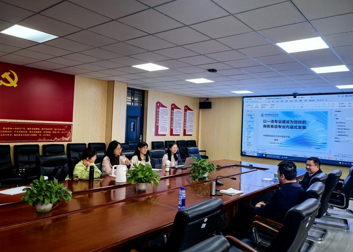 商务英语专业负责人欧秋耘(左四)、骨干教师闫冰(左三)、新进博士教师裴婷(左一)、辛璄怡(左二)与袁奇教授展开交流