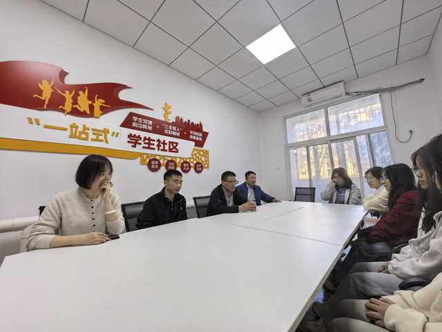 本网讯(通讯员 余淅 姜美舞)10月31日下午,为深入了解2024级新生基本情况和思想动态,帮助他们尽快融入新环境,适应新生活,学院“师友•学友行动”联系单位基建处处长邢宽广、副处长刘玉祥深入学院“一站式”学生社区走访联系寝室。党委副书记陈凌云、“一站式”学生社区学业导师聂琼、新生辅导员李扬陪同全程参加。