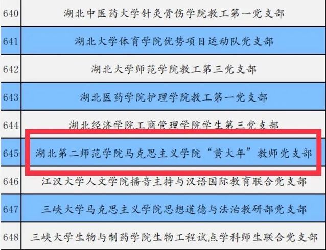 2022年2月21日,教育部思想政治工作司公示了第三批新时代高校党建示范创建和质量创优工作遴选结果,湖北第二师范学院马克思主义学院(后简称马克思主义学院)“黄大年”教师党支部入选“全国党建工作样板支部”培育创建单位。据悉,此次共遴选产生11个全国党建工作示范高校、100个全国党建工作标杆院系、1000个全国党建工作样板支部,“黄大年”教师党支部有幸成为其中之一。