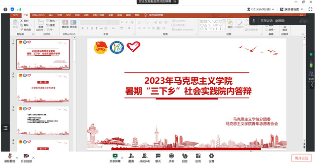 8月29日晚,马克思主义学院于线上举办2023年暑期三下乡院内答辩活动。马克思主义学院分团委书记樊勇及分团委各学生组织代表担任评委,马克思主义学院暑期各社会实践队伍成员参加会议。