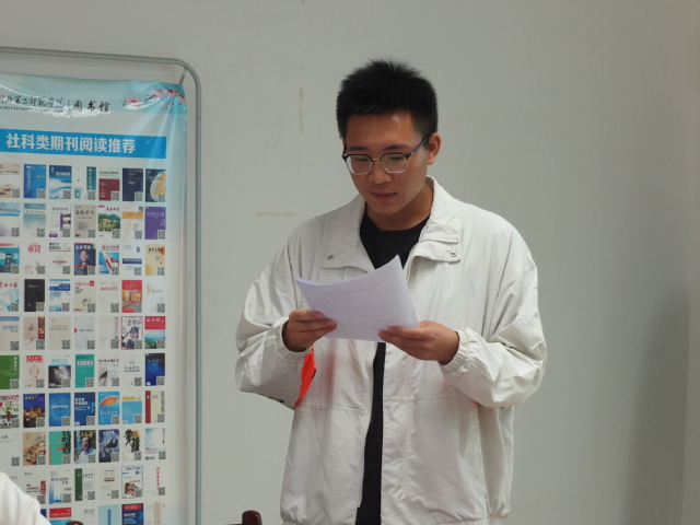 在比赛过程中,11位参赛选手依次进行了精彩的读书分享。马克思主义学院2020级思想政治教育1班谭启栋以9.282的高分获得第一名,他的参赛书目是《中国经济发展的世界意义》,他从中国抗疫谈到了一带一路;从新冠疫情下国内外的应急措施和救助政策的对比引出中国经济的内功之强大;从中国经济的韧性和具有战略性的一带一路来论证中国经济之强大。马克思主义学院2020级思想政治教育2班王炳森分享《谁是最可爱的人》一书,旨在纪念志愿军入朝作战70周年,赞颂新时代最可爱的人--疫情之中勇敢逆行的医护工作者。“大家都是以书会友,通过这次活动,不仅让我加深了对书籍的理解,也让我交到了很多的朋友。”参赛选手谭启栋在采访中说道。